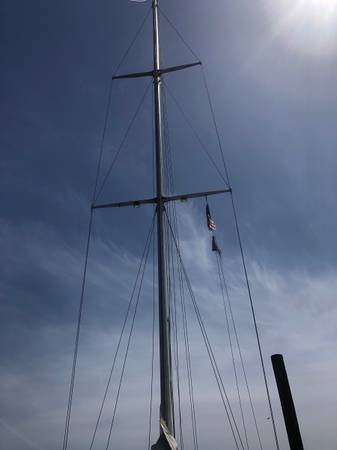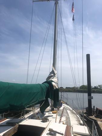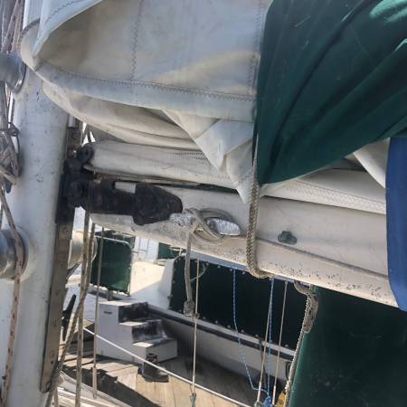 I have sail in excellent condition which is about 46’ tall and extends out about 21’. Sail is off 41’ sail boat and comes with boom and parts. The white Sail has 24 eyelets and is in excellent condition and has a green snapped on cover to protect when stored as well as stopping any flapping when not in use. Thanks for looking and no text