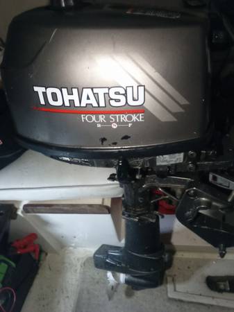 Tohatsu 4 hp 4 stroke outboard motor with less than 40 hours on her. She's been well taken care of , never any issues start on first pull every time and runs like a 8 hp even though it a four. Used to push a 24 San Juan for one season, paid $1500.00 brand new last year. Check it out, it's a steal for $550.00.
