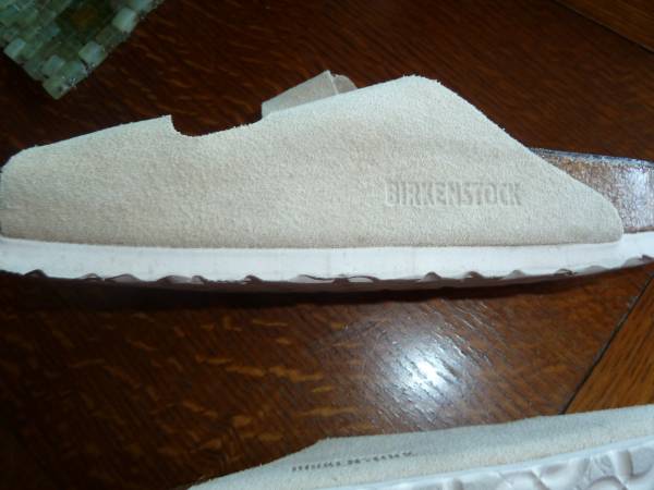 Suede beige leather with cork footbed, white sole. Yours for only $45.00, o.b.o. Cash only.