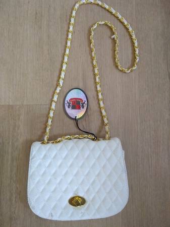 Features white vegan leather, copper zipper, gold tone hardware. Bag measures 9"L x 7"W x 2.5"D. Shoulder strap measures 22" long (one side)
