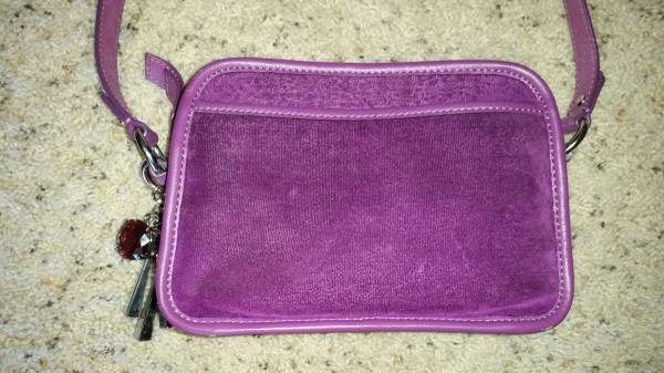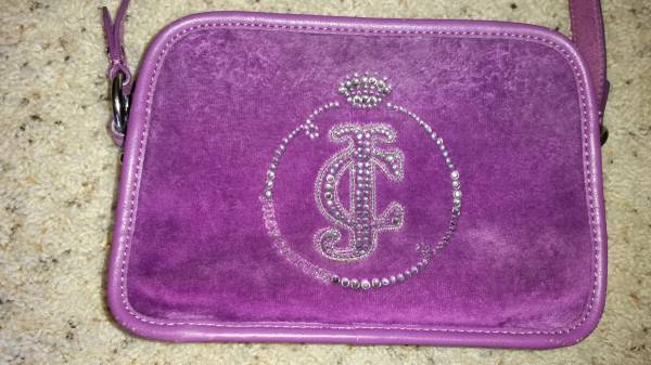Authentic Juicy Couture velour purse in purple. Leather straps and trim. Handy back pocket, inside zipper pocket with leather pull and zipper closure on top. Jeweled front with dangling jewels on side, which are also removable.