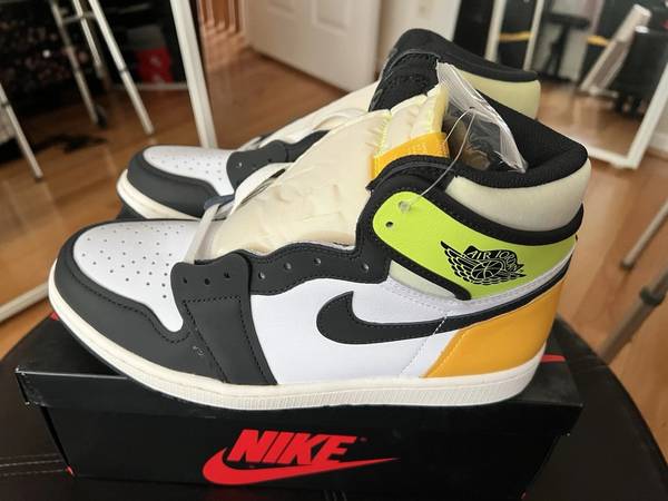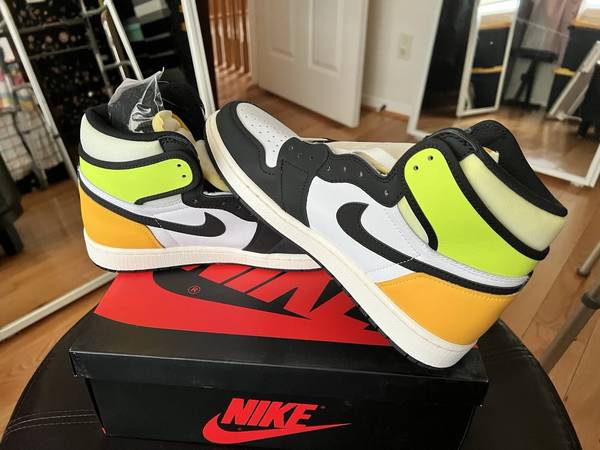 Elevate your sneaker game with these brand new Air Jordan 1 Retro High OG Volt sneakers. Designed for men with a US shoe size of 9.5 & 10, these sneakers feature a high-top shoe shaft style and a stylish multicolor design. The silhouette of the sneakers is Jordan 1 Retro High OG Volt, which is a popular choice among sneakerheads.