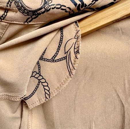 Stylish collared tan shirt with a unique western chain, rope, & tassel pattern. Slight shoulder padding (removable). Perfect for casual or formal occasions. Very good used condition 16” shoulder...