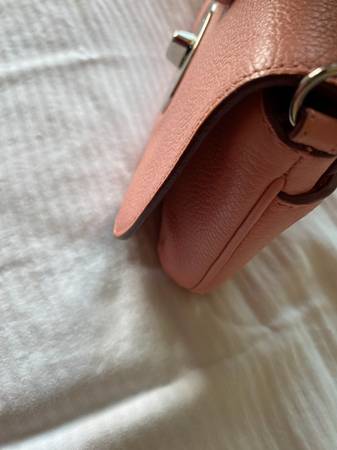 Nice authentic COACH leather crossbody bag. Excellent pre-owned condition. Used few times. No flaws. Clean. Pink color. Flap with a turn lock closure. Exterior back slide pocket. Inside: one slide wall pockets and 2 compartments. COACH signature fabric lining. Beautiful silver tone metal hardware. Elegant Coach engraved metal plate in front.