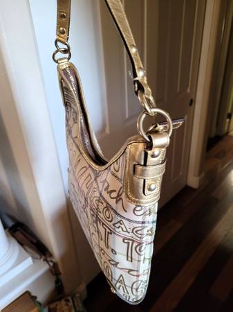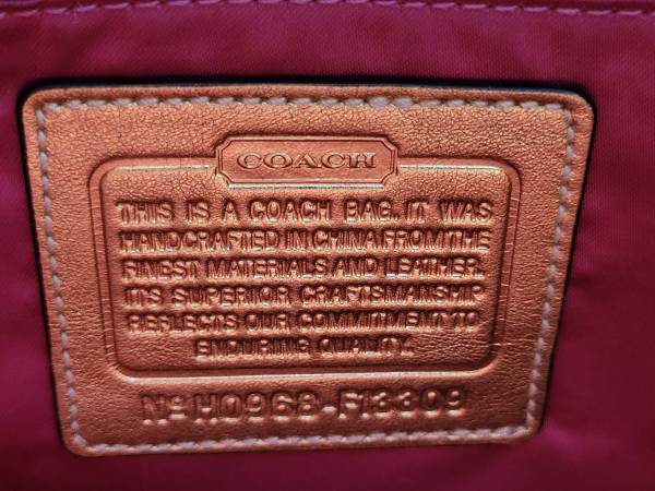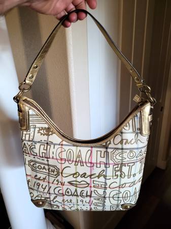 This Model F13309 purse is masterfully crafted by Coach in the Tattersall Graffiti pattern. It is made of cream-colored waterproof canvas and leather that is emblazoned with “Coach” in Gold lettering in a fun pattern. It's accented with a gold tone leather single strap. The zippered rose sateen fabric interior has 2 small open front pockets, and a zippered back pocket. Purse body measures: Height 13.5", Width 13" Depth 5.5". The additional drop when adding the strap is 8". It is missing the Coach hangtag and the crossbody strap, as reflected in the reduced asking price. Still a great over-the-shoulder carry bag.
