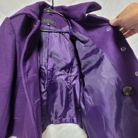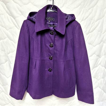 This Giacca wool jacket is a purple grape color that would look great with denim, or anything else. It is fully lined in a dark grape lining. It has wonderful detailing, a collar that can be worn up or open, 2 stylish slash front pockets and 4 large buttons down the front (and an extra inside). It has wonderful needle stitching details and a fully detachable hood. The jacket is a size large and measures about 21” across the chest and 25” long. It's made of wool, polyester & rayon with polyester lining. Dry clean. Like new!