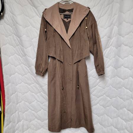 This stylish Two Tone Gallery Raincoat has a warm brown and slightly shimmery shell made of Polyester and Rayon and fully lined in nylon. It's designed with a lot of great detailing including: drawstring hood collar, 2 deep slash pockets, 3 toggle buttons down the front, a drawstring waist, pleated back and elastic cuffs. Size 10 Medium, the vintage coat measures 20” chest width and 50” long. Dry clean only.