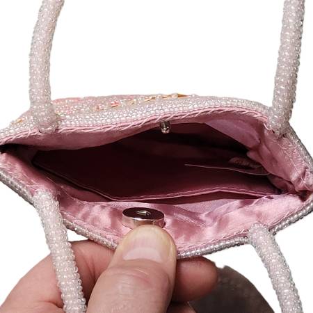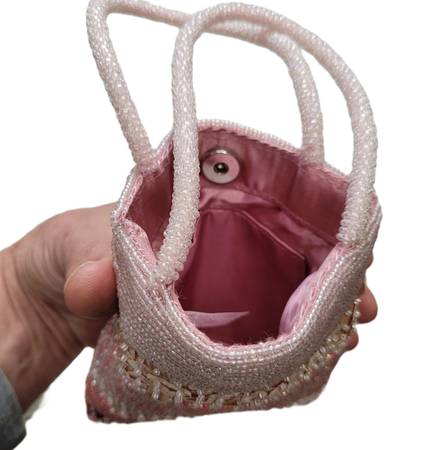 Darling little Pink Beaded Purse Pocketbook is fully lined in pink satin. The interior snaps open and the compartment has a small pocket within. It can be used as a mini clutch or a purse for a child. In excellent condition. Purse body measures: 5” wide, 6.5” tall 11” with handles, 4.5” handle drop. Great gift for yourself or another!
