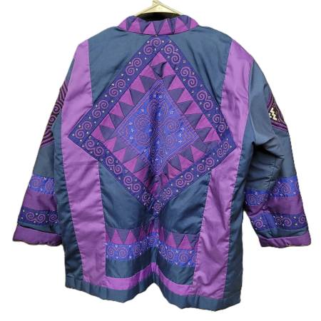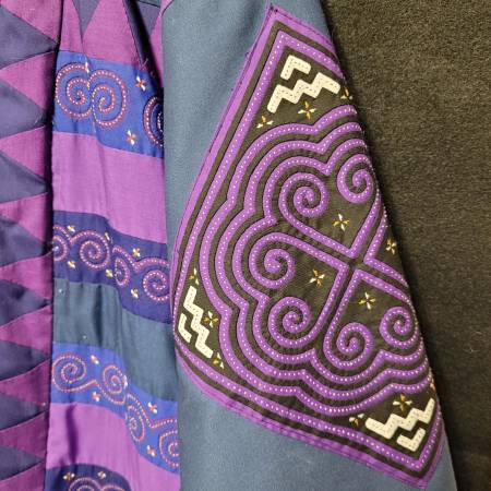 This Hmong hand quilted Jacket is a beautiful piece of wearable art. In blues and purples, the coat has amazing Hmung hand quilting in geometric patterns on the front, back and sleeves. The coat is about a size medium. It measures 18” across and 26” long. It's cotton and can be machine washed on cold, delicate, inside out. Like new!