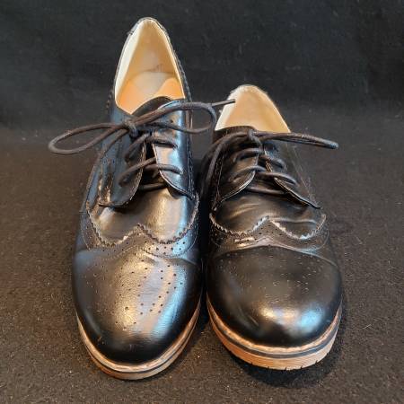 These handsome Black Lace Up Oxford Wingtips have a perforated pinking sheared design. Made of Vegan Leather, these Brogues have a cushioned footbed and are comfortable to slip right on and wear for hours. Water resistant, they have quality stitching around the top sole, and an anti-slip rubber sole complete with a 1.38" crepe heel for style and comfort. In gently worn condition. A women's size nine.