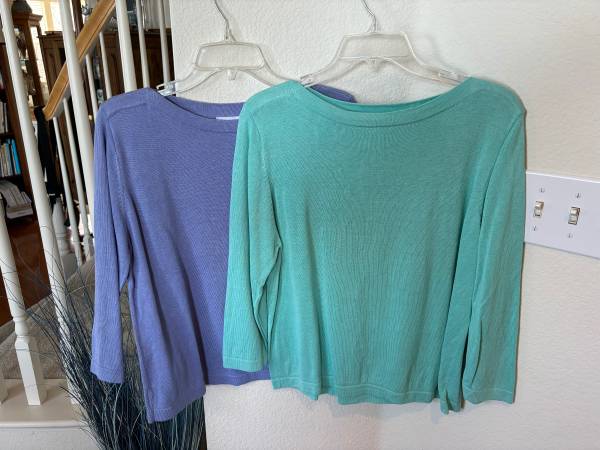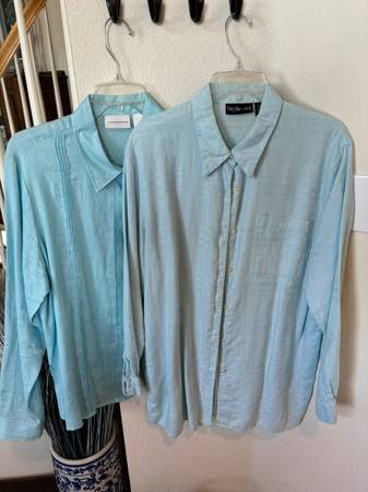 I have a bunch of classic button-front long-sleeved women’s shirts or blouses in multiple colors, that no longer fit me. Sizes 14-14W-16-16W-L-XL, many 100% cotton, a few linen or rayon blends. And 1 pink and 1 lavender in size M. 18 in all. All in great condition, little wear, no stains. $5 each, discount for multiple purchase. Also have a variety of silk/dressier tops for $10 each.