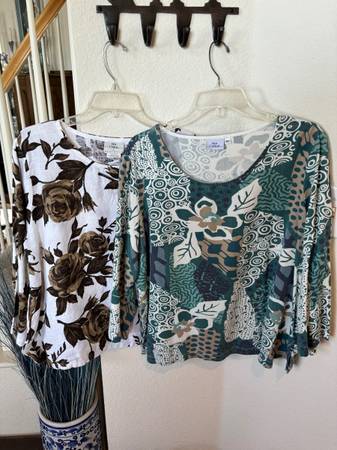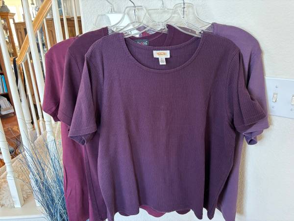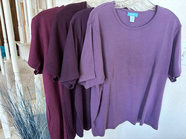 I have 4 short sleeved t-shirts from Talbots and Macy’s for sale for $3 each, or all 4 for $10. All are 100% cotton, 3 with round necks, 1 v-neck. Colors vary from shades of plum or burgundy to purple. All are in excellent condition, without flaws or odors, but no longer fit me. Cash in person only.