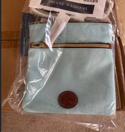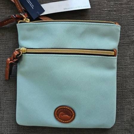 Authentic, NEW Dooney & Bourke double zip crossbody bag, including tags. Strap is still wrapped. Beautiful shade of a soft, baby blue. Measurements are 7" 1/2 x 8". Real leather. Zippers function properly. Perfect to carry your cell phone and wallet anywhere you go. Adorable with any outfit!
