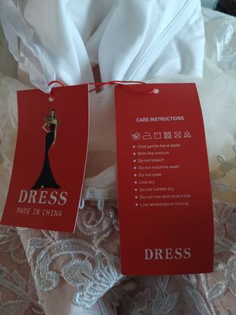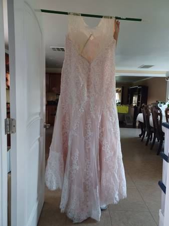 NEW Wedding dress size 16. Tags are still attached to dress. Color is light peach lining with white lace over lining. Attached is Care Instructions. I purchased for $130 but was to expensive to return to vendor, since it was my error in ordering size. Very Beautiful dress. Cash only.