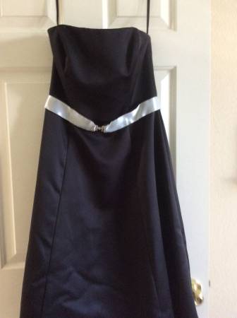 Black satin dress, grey band at fitted waist,” Michelangelo”. Fluffy skirt Sleeveless, open shoulders Size 6