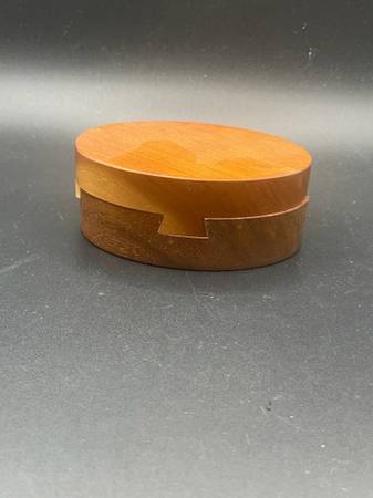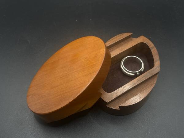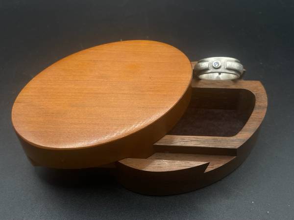 This wood trinket box features a smooth, sliding lid, and is made of wood, possibly walnut or cherry or both.