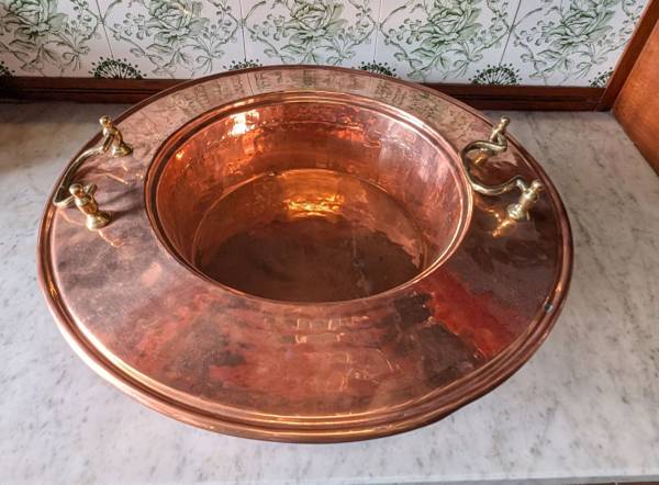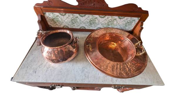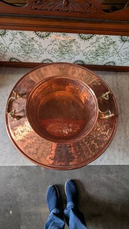 Antique Hammered Turkish Cauldron with handle. Beautiful hand-hammered Turkish serving vessel. They complement each other nicely. Material: Copper with brass handles Type: Antique wash basin or...