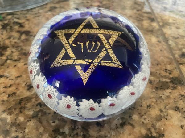 Vintage Judaica Murano Glass Millefiori Star of David Paperweight Vintage Murano Paperweight with Star of David. Blue background, gold star with white and red millefiori boarder. Excellent condition...