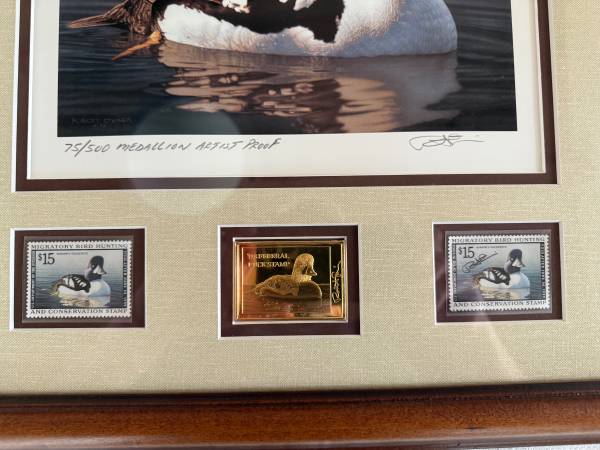 Robert Steiner Professionally Framed Rare Medallion Proof, 75/500. The 1998 Federal Duck Stamp Print features Barrow’s Goldeneye Duck by Robert Steiner. Only 500 Medallion Proof Edition Prints were commissioned. Print and frame are in both in excellent problem free condition.