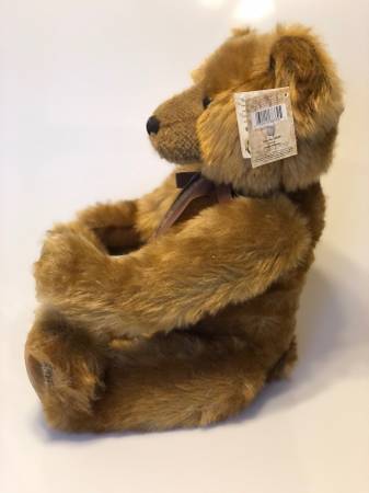 This 20 inch, fully jointed golden brown teddy bear has sueded paws (one signed "Russ Berrie") and a flocked ribbon tie.