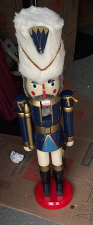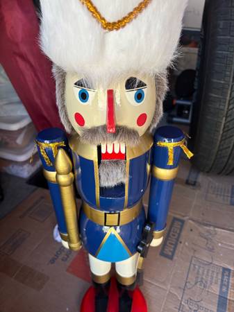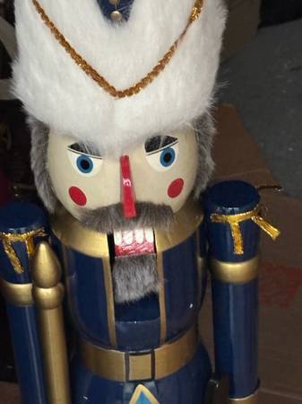 Add bold Christmas magic to your holiday dΓ©cor with this large wooden Nutcracker soldier! Standing tall with a brilliant royal blue uniform, gold trim, and fluffy white hat, this festive figure...