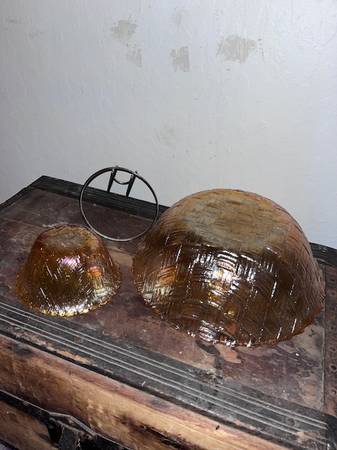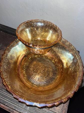 This is a beautiful, nostalgic golden iridescent Indiana Carnival Glass chip and dip set with gold plated metal dip holder along the rim of the chip bowl. I have had it in storage. There are no chips or breaks. See photos. If interested, please call only. Please do not text or email. Will not respond to emails or text messages. Please don't ask if it is still available. We won't respond to google text subscribers or code requests. Local pick up only, no deliveries. Cash only.