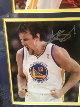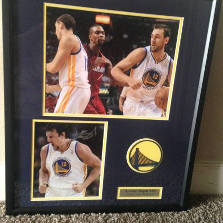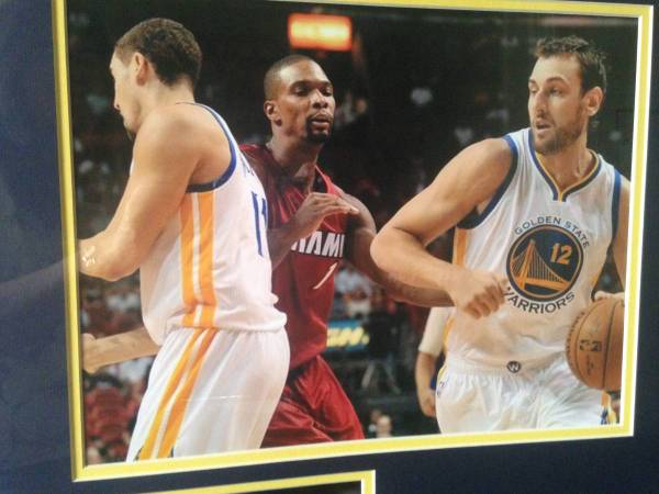 Signed by Warrior Andrew Bogut #12. Bogut also photographed with Heat's Chris Bosh and back of Klay Thompson. Frame is approx. 21 x 25 with glass and ready to hang. This is a great collector's...