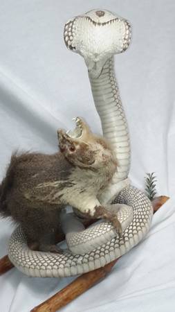 Vintage 1970's Cobra fighting Mongoose taxidermy display from Vietnam War era. The mongoose has lost much of its fur, needs some restoration. Nice piece in otherwise good condition.