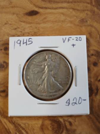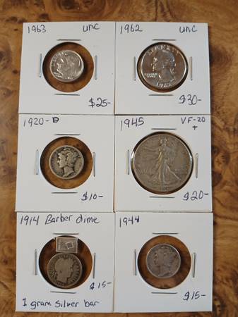 1945 WALKING LIBERTY HALF DOLLAR. 1962 WASHINGTON QUARTER UNCIRULATED. 1944 MERCURY DIME. 1920-D MERCURY DIME. 1914 BARBER DIME WITH A 1 GRAM SILVER BAR. 1963 ROOSEVELT DIME UNCIRULATED. THERE IS A RETAIL VALUE OF $130.00 OR MORE. NO LOW OFFERS PLEASE