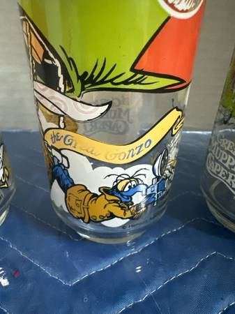 Vintage 1981 The Great Muppet Caper Glasses from McDonald’s. Set of 4 includes Miss Piggy glass, Kermit the frog/ Animal glass, and (2) Fozzie Bear / Gonzo glasses. The text on one of the Gonzo glasses is faded (see pic). Otherwise, all glasses are in great, vintage condition, no chips. Cash preferred.