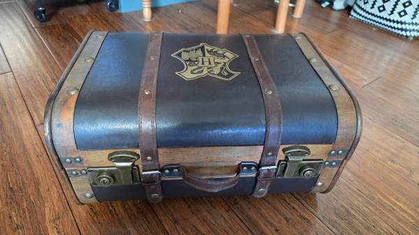 Vintage-style trunk with Hogwarts Hufflepuff emblem with the necessary gifts for your wizarding student. Or a badger fan?