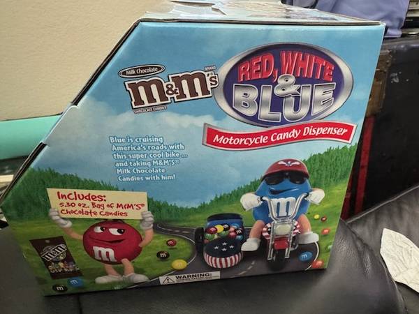 NEW!!! ...BLUE IS CRUISING AMERICA'S ROADS WITH THIS SUPER COOL BIKE... AND TAKING M&MS MILK CHOCOLATE CANDIES WITH HIM! INCLUDES: - Vintage M&M's RED, WHITE, & BLUE Motorcycle Candy...
