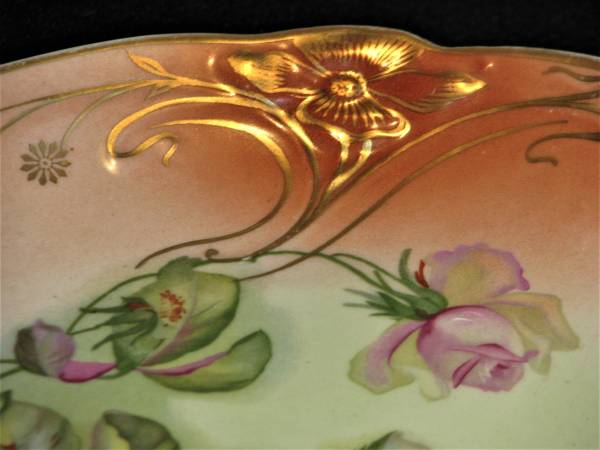 This amazing shallow dish features an upraised embossed edge design with beautifully hand painted yellow and pink roses and leaves on a green, rose and yellow background accented with additional accent strokes on top. The border is styled with 22 kt embossed hand painted gold floral edging and floral design. Made by TC Altwasser in Germany around 1900-1920, this piece measures 12 ⅜" across and is 1 ⅝" high. The piece is in really great condition; the gold is in excellent condition for age. It is stunning!