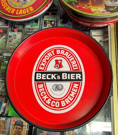 The vintage Falstaff tray is especially large, measuring 24" in diameter: SOLD