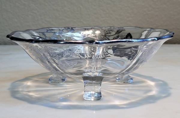 This three footed Candy Dish or Bowl is made by the Fostoria Glass Company. It is adorned with the “Flanders Poppy” design in sterling silver by the Silver City Company. The Poppy is the California State Flower! The design is sharp and crisp. From the 1920’s-1930’s. It measures 7” wide and 2 ½” high..