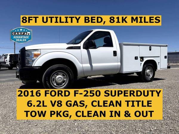 2016 FORD F-250 SUPER DUTY 8FT UTILITY BED, 6.2L V8 GAS AUTOMATIC, 81K MILES. 8FT UTILITY BED, TOW PACKAGE; CLEAN TITLE. VERY CLEAN INSIDE AND OUT! COMMERICAL FINANCING AVAILABLE! COMPARE OUR PRICES!! 6.2L GAS POWERFUL MOTOR. HEAVY DUTY TOW PACKAGE, CLEAN INSIDE AND OUT. KNAPHEIDE BED FLEET MAINTAINED.LUMBER RACKS IN STOCK! READY FOR WORK! WHY BUY NEW CLOSE TO $65K? WE DELIVER TO YOUR OFFICE! BY APPOINTMENT ONLY. CALL 209-535-6209 VISIT OUR NEW LOCATION 1189 MAIN ST OAKLEY, CA 94561. RT MOTORS IS YOUR SOURCE FOR QUALITY PRE-OWNED TRUCKS. THOUSANDS OF SATISFIED CLIENTS AND REPEAT BUYERS NAMED TOP DEALER BY CAR GURUS AND ALL 5 STAR REVIEWS ON EVERY WEBISTE! NO HAGGLE LOW PRICE! PLEASE CALL 209-535-6209 BY APPOINTMENT ONLY. CASH PRICE, IF YOUR PURCHASE WILL REQUIRE FINANCING PLEASE ADVISE US IN ADVANCE. WE HAVE A GREAT SELECTION OF TRUCKS! WE ARE YOUR SOURCE FOR QUALITY LOW MILEAGE PRE-OWNED TRUCKS! LONG BED SHORT BED CREW CAB STANDARD FORD CHEVY DODGE SERVICE BED TOOL BOXES UTILITY BED JOB SITE READY 1500 2500 3500 DURAMAX POWERSTROKE CUMMINS WE CARRY A WIDE SELECTION