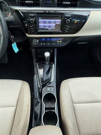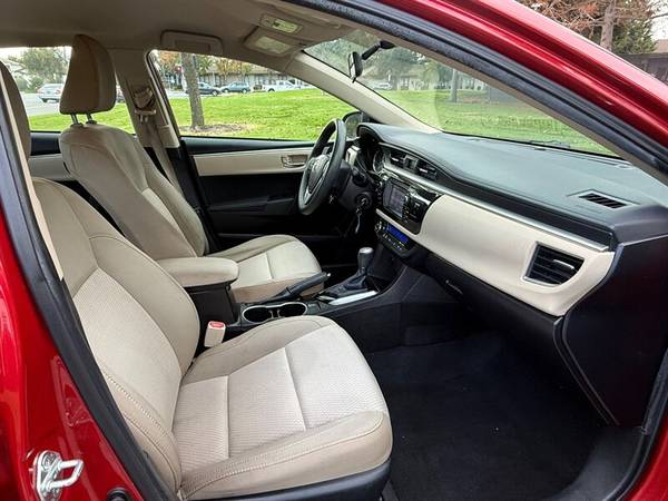 This is a 2015 Toyota Corolla LE, a four-door sedan with a 1.8-liter gasoline engine and front-wheel drive. It comes equipped with a touchscreen radio with Bluetooth capability and a backup camera for easy parking. The car is a beautiful red color with beige interior seats. It has a clean title, and it's been smogged recently, so it's ready to go. The mileage is about 127,150 miles, and it's had two private owners only. Plus, it has four brand-new tires.