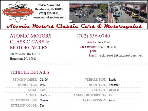 This vehicle is located at Atomic Motors Classic Cars & Motorcycles in Henderson, NV just 20 mins from the fabulous Las Vegas Strip. Come down and see us or call Jack Root at 702-556-0740 or the sales dept at 702-826-3811 ext 2. Additional pictures and videos may be found on our site at www.atomicmotors.net