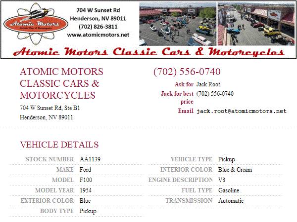 This vehicle is located at Atomic Motors Classic Cars & Motorcycles in Henderson, NV just 20 mins from the fabulous Las Vegas Strip. Come down and see us or call Jack Root at 702-556-0740 or the sales dept at 702-826-3811 ext 2. Additional pictures may be found on our site at www.atomicmotors.net