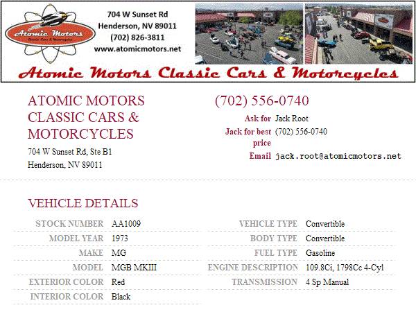 This vehicle is located at Atomic Motors Classic Car Sales and Restorations in Henderson, NV just 20 mins from the fabulous Las Vegas Strip. Come down and see us or call Jack for best price at 702-556-0740 or call our sales dept at 702-826-3811 ext 2 for general information. Additional pictures and videos may be found on our site at www.atomicmotors.net