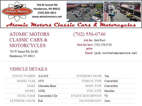 This vehicle is located at Atomic Motors Classic Car Sales and Restorations in Henderson, NV just 20 mins from the fabulous Las Vegas Strip. Come down and see us or call Jack for best price at 702-556-0740 or call our sales dept at 702-826-3811 ext 2 for general information. Additional pictures and videos may be found on our site at www.atomicmotors.net