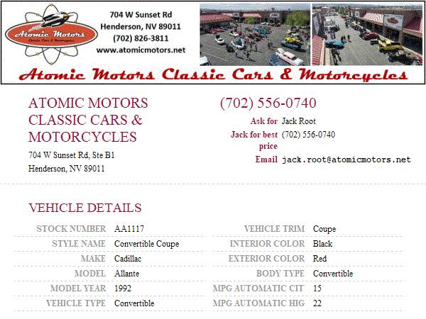This vehicle is located at Atomic Motors Classic Car Sales and Restorations in Henderson, NV just 20 mins from the fabulous Las Vegas Strip. Come down and see us or call Jack for best price at 702-556-0740 or call our sales dept at 702-826-3811 ext 2 for general information. Additional pictures and videos may be found on our site at www.atomicmotors.net