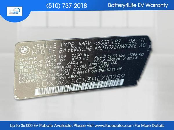 $2,000 instant rebate for qualifying Santa Clara County Residents (SVCE) and San Mateo County Residents (PCE) and Contra Costa, Marin County, Napa County, Solano County Residents (MCE), (not all customers qualify). For San Jose Residents (SJCE), please review the to verify if you qualify.Additional PG&E $4,000 rebate for income qualified buyers (not all customers qualify), Driving Clean Assistance Program (DCAP) participating Dealership.Safety Done, AS LOW as $299 to drive off! Up to 72 months, 8.99% APR on approved credit!$18.30 for every $1000 borrowed, Available for Prime Credit Buyers, Not available for Uber/ Lyft DriverExtended Warranty available up to 60 mo/100,000 mi., Powertrain Plus, starting as low as $1999. ?? Se Habla Español, Teresa (510) 319-0751??No Licencia?, Matrícula Consular?, ITIN?, Bancarrota?, Reposiciones?, Nuevo en el Trabajo?, 1er Comprador?, No Crédito? -Está Aprobado!We Speak: English, Spanish, & Chinese (Cantonese)????International Driver License?, Foreign License?, Matricula?, Foreign Passport? or CA ID? No problem, We can get you car insurancE???? Easy Financing @www.faceautos.com , First Time buyer, Student Income, ITIN Welcome, SSI , Self - Employed, Uber And Lyft , Matricula ID , 0 Credit Score , Bankruptcy OK, Rate As Low As 8.99% on approved credit!2011 BMW X3, 5UXWX5C53BL710259, 125,000, xDrive28i Sport Utility 4D, 6-Cyl, 3.0 Liter, Auto 8-Spd w/OD & Stptrnc, AWD, 4, 6, SUV, Gasoline, 240, Black, Black, , , , 8407 Central Ave Ste 2038, Newark, CA 94560, (510) 737-2018All advertised prices exclude government fees and taxes, any finance charges, any dealer document preparation charge, and any emission testing charge. While we try to make sure that all prices posted here are accurate at all times, we cannot be responsible for typographical and other errors that may appear on the site. We make every effort to provide you the most accurate, up-to-the-minute information; however, it is your responsibility to verify with the Dealer that all details listed are accurate. The dealership is not responsible for typographical, pricing, product information, advertising or shipping