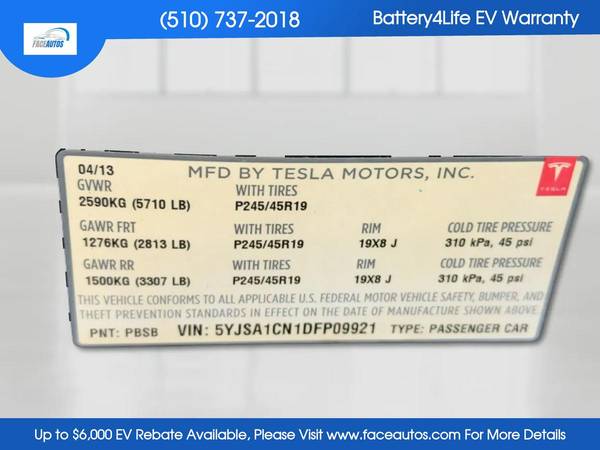 $2,000 instant rebate for qualifying Santa Clara County Residents (SVCE) and San Mateo County Residents (PCE) and Contra Costa, Marin County, Napa County, Solano County Residents (MCE), (not all customers qualify). For San Jose Residents (SJCE), please review the Full Program Guidelines and List of qualifying EVs to verify if you qualify.Additional PG&E $4,000 rebate for income qualified buyers (not all customers qualify), Driving Clean Assistance Program (DCAP) participating Dealership.Safety Done, AS LOW as $299 to drive off! Up to 72 months, 8.99% APR on approved credit!$18.30 for every $1000 borrowed, Available for Prime Credit Buyers, Not available for Uber/ Lyft DriverExtended Warranty available up to 60 mo/100,000 mi., Powertrain Plus, starting as low as $1999. Please click here for more info?? Se Habla Español, Teresa (510) 319-0751??No Licencia?, Matrícula Consular?, ITIN?, Bancarrota?, Reposiciones?, Nuevo en el Trabajo?, 1er Comprador?, No Crédito? -Está Aprobado!We Speak: English, Spanish, & Chinese (Cantonese)????International Driver License?, Foreign License?, Matricula?, Foreign Passport? or CA ID? No problem, We can get you car insurancE???? Easy Financing @www.faceautos.com , First Time buyer, Student Income, ITIN Welcome, SSI , Self - Employed, Uber And Lyft , Matricula ID , 0 Credit Score , Bankruptcy OK, Rate As Low As 8.99% on approved credit!2013 Tesla Model S, 5YJSA1CN1DFP09921, 160,364, Sedan 4D, AC Electric Motor, Single-Speed Fixed Gear, RWD, 4, , Sedan, Electric, 302, Black, Other, , , , 8407 Central Ave Ste 2038, Newark, CA 94560, (510) 737-2018All advertised prices exclude government fees and taxes, any finance charges, any dealer document preparation charge, and any emission testing charge. While we try to make sure that all prices posted here are accurate at all times, we cannot be responsible for typographical and other errors that may appear on the site. We make every effort to provide you the most accurate, up-to-the-minute information; however, it is your responsibility to verify with the Dealer that all details listed are accurate. The dealership is not responsible for typographical, pricing, product information, advertising or shippingBuy used EV in Bay Area