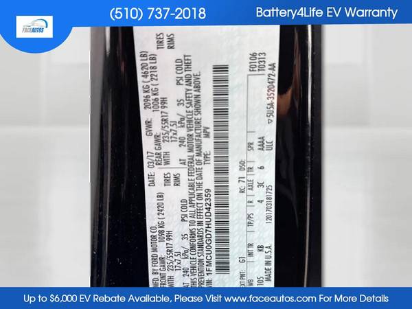 Maintenance inspection completedAir filter replacedCabin air filter replaced/cleanedFuel injector(s) replacedOil and filter changedSafety Done, smog done, car Run/Drive/Shift in good conditionAS LOW as $299 to drive off! Up to 72 months, 8.99% APR on approved credit!$18.30 for every $1000 borrowed, Available for Prime Credit Buyers, Not available for Uber/ Lyft DriverExtended Warranty available up to 60 mo/100,000 mi., Powertrain Plus, starting as low as $1999. Please click here for more info?? Se Habla Español, Teresa (510) 319-0751??No Licencia?, Matrícula Consular?, ITIN?, Bancarrota?, Reposiciones?, Nuevo en el Trabajo?, 1er Comprador?, No Crédito? -Está Aprobado!We Speak: English, Spanish, & Chinese (Cantonese)????International Driver License?, Foreign License?, Matricula?, Foreign Passport? or CA ID? No problem, We can get you car insurancE???? Easy Financing @www.faceautos.com , First Time buyer, Student Income, ITIN Welcome, SSI , Self - Employed, Uber And Lyft , Matricula ID , 0 Credit Score , Bankruptcy OK, Rate As Low As 8.99% on approved credit!2017 Ford Escape, 1FMCU0GD7HUD42359, 104,775, SE Sport Utility 4D, 4-Cyl, EcoBoost, 1.5T, Auto, 6-Spd w/SelShft, FWD, 4, 4, SUV, Gasoline, 179, Black, Gray, , , , 8407 Central Ave Ste 2038, Newark, CA 94560, (510) 737-2018All advertised prices exclude government fees and taxes, any finance charges, any dealer document preparation charge, and any emission testing charge. While we try to make sure that all prices posted here are accurate at all times, we cannot be responsible for typographical and other errors that may appear on the site. We make every effort to provide you the most accurate, up-to-the-minute information; however, it is your responsibility to verify with the Dealer that all details listed are accurate. The dealership is not responsible for typographical, pricing, product information, advertising or shippingBuy used EV in Bay Area