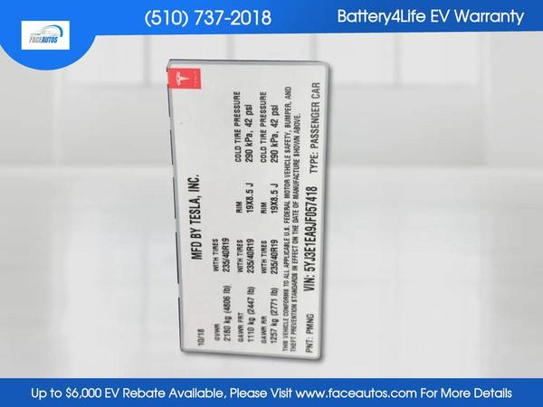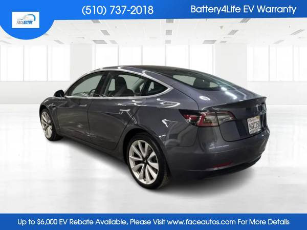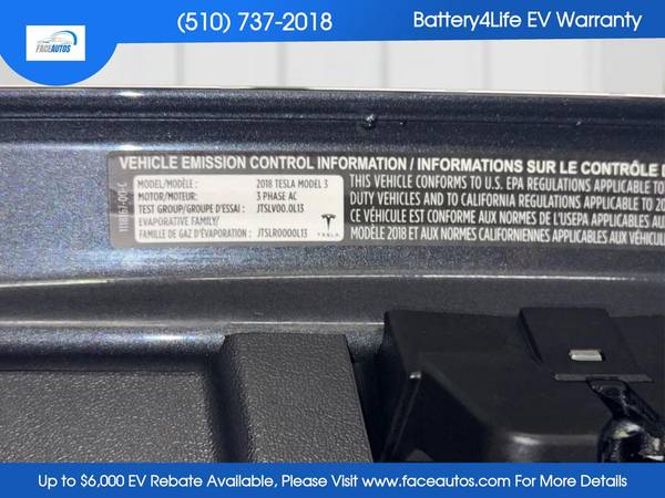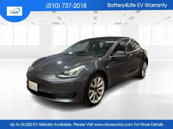 Autopilot, All Black premium Interior, Midnight Silver metallic (PMNG), 19' Sport Wheels, Long Range Rear-Wheel Drive, Battery and Drive unit Limited Warranty Expires Oct 20, 2026 or 120000 total miles, whichever comes first $2,000 instant rebate for qualifying Santa Clara County Residents (SVCE) and San Mateo County Residents (PCE) and Contra Costa, Marin County, Napa County, Solano County Residents (MCE), (not all customers qualify). For San Jose Residents (SJCE), please review the Full Program Guidelines and List of qualifying EVs to verify if you qualify.Additional PG&E $4,000 rebate for income qualified buyers (not all customers qualify), Driving Clean Assistance Program (DCAP) participating Dealership.Safety Done, AS LOW as $299 to drive off! Up to 72 months, 8.99% APR on approved credit!$18.30 for every $1000 borrowed, Available for Prime Credit Buyers, Not available for Uber/ Lyft DriverExtended Warranty available up to 60 mo/100,000 mi., Powertrain Plus, starting as low as $1999. Please click here for more info?? Se Habla Español, Teresa (510) 319-0751??No Licencia?, Matrícula Consular?, ITIN?, Bancarrota?, Reposiciones?, Nuevo en el Trabajo?, 1er Comprador?, No Crédito? -Está Aprobado!We Speak: English, Spanish, & Chinese (Cantonese)????International Driver License?, Foreign License?, Matricula?, Foreign Passport? or CA ID? No problem, We can get you car insurancE???? Easy Financing @www.faceautos.com , First Time buyer, Student Income, ITIN Welcome, SSI , Self - Employed, Uber And Lyft , Matricula ID , 0 Credit Score , Bankruptcy OK, Rate As Low As 8.99% on approved credit!2018 Tesla Model 3, 5YJ3E1EA9JF057418, 102,974, Long Range Sedan 4D, AC Electric Motor, Single-Speed Fixed Gear, RWD, 4, , Sedan, Electric, , Gray, Black, , , , 8407 Central Ave Ste 2038, Newark, CA 94560, (510) 737-2018All advertised prices exclude government fees and taxes, any finance charges, any dealer document preparation charge, and any emission testing charge. While we try to make sure that all prices posted here are accurate at all times, we cannot be responsible for typographical and other errors that may appear on the site. We make every effort to provide you the most accurate, up-to-the-minute information; however, it is your responsibility to verify with the Dealer that all details listed are accurate. The dealership is not responsible for typographical, pricing, product information, advertising or shippingBuy used EV in Bay Area