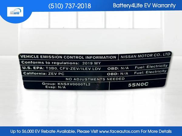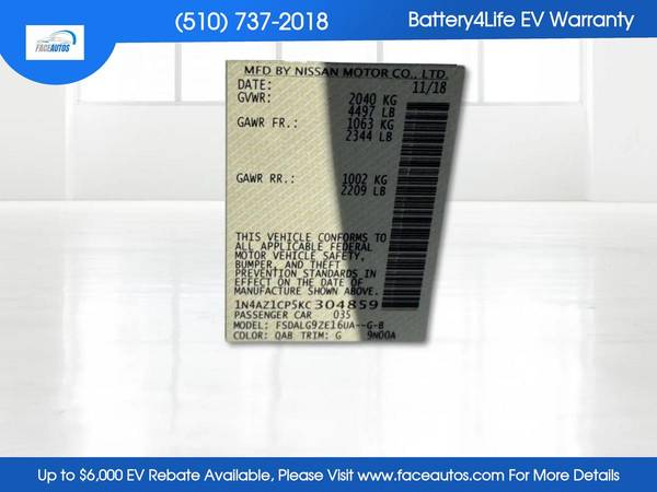 $2,000 instant rebate for qualifying Santa Clara County Residents (SVCE) and San Mateo County Residents (PCE) and Contra Costa, Marin County, Napa County, Solano County Residents (MCE), (not all customers qualify). For San Jose Residents (SJCE), please review the Full Program Guidelines and List of qualifying EVs to verify if you qualify.Additional PG&E $4,000 rebate for income qualified buyers (not all customers qualify), Driving Clean Assistance Program (DCAP) participating Dealership.Safety Done, AS LOW as $299 to drive off! Up to 72 months, 8.99% APR on approved credit!$18.30 for every $1000 borrowed, Available for Prime Credit Buyers, Not available for Uber/ Lyft DriverExtended Warranty available up to 60 mo/100,000 mi., Powertrain Plus, starting as low as $1999. Please click here for more info?? Se Habla Español, Teresa (510) 319-0751??No Licencia?, Matrícula Consular?, ITIN?, Bancarrota?, Reposiciones?, Nuevo en el Trabajo?, 1er Comprador?, No Crédito? -Está Aprobado!We Speak: English, Spanish, & Chinese (Cantonese)????International Driver License?, Foreign License?, Matricula?, Foreign Passport? or CA ID? No problem, We can get you car insurancE???? Easy Financing @www.faceautos.com , First Time buyer, Student Income, ITIN Welcome, SSI , Self - Employed, Uber And Lyft , Matricula ID , 0 Credit Score , Bankruptcy OK, Rate As Low As 8.99% on approved credit!2019 Nissan LEAF, 1N4AZ1CP5KC304859, 27,195, SL Hatchback 4D, AC Electric Motor, Single-Speed Fixed Gear, FWD, 4, , Hatchback, Electric, 147, White, Black, , , , 8407 Central Ave Ste 2038, Newark, CA 94560, (510) 737-2018All advertised prices exclude government fees and taxes, any finance charges, any dealer document preparation charge, and any emission testing charge. While we try to make sure that all prices posted here are accurate at all times, we cannot be responsible for typographical and other errors that may appear on the site. We make every effort to provide you the most accurate, up-to-the-minute information; however, it is your responsibility to verify with the Dealer that all details listed are accurate. The dealership is not responsible for typographical, pricing, product information, advertising or shipping