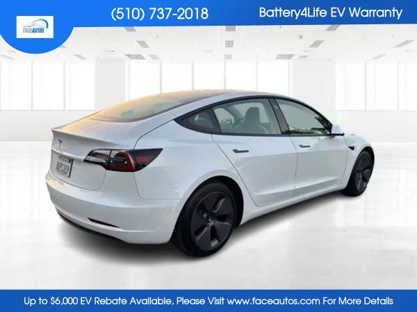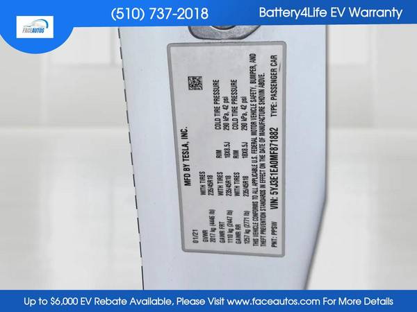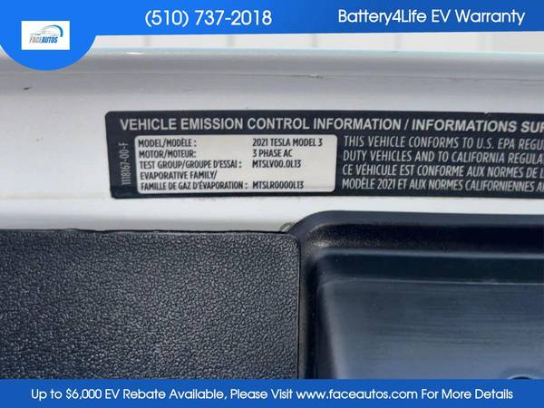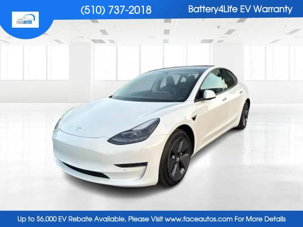 $2,000 instant rebate for qualifying Santa Clara County Residents (SVCE) and San Mateo County Residents (PCE) and Contra Costa, Marin County, Napa County, Solano County Residents (MCE), (not all customers qualify). For San Jose Residents (SJCE), please review the Full Program Guidelines and List of qualifying EVs to verify if you qualify.Additional PG&E $4,000 rebate for income qualified buyers (not all customers qualify), Driving Clean Assistance Program (DCAP) participating Dealership.Safety Done, AS LOW as $299 to drive off! Up to 72 months, 8.99% APR on approved credit!$18.30 for every $1000 borrowed, Available for Prime Credit Buyers, Not available for Uber/ Lyft DriverExtended Warranty available up to 60 mo/100,000 mi., Powertrain Plus, starting as low as $1999. Please click here for more info?? Se Habla Español, Teresa (510) 319-0751??No Licencia?, Matrícula Consular?, ITIN?, Bancarrota?, Reposiciones?, Nuevo en el Trabajo?, 1er Comprador?, No Crédito? -Está Aprobado!We Speak: English, Spanish, & Chinese (Cantonese)????International Driver License?, Foreign License?, Matricula?, Foreign Passport? or CA ID? No problem, We can get you car insurancE???? Easy Financing @www.faceautos.com , First Time buyer, Student Income, ITIN Welcome, SSI , Self - Employed, Uber And Lyft , Matricula ID , 0 Credit Score , Bankruptcy OK, Rate As Low As 8.99% on approved credit!2021 Tesla Model 3, 5YJ3E1EA0MF871882, 107,846, Standard Range Plus Sedan 4D, AC Electric Motor, Single-Speed Fixed Gear, RWD, 4, , Sedan, Electric, , White, Black, , , , 8407 Central Ave Ste 2038, Newark, CA 94560, (510) 737-2018All advertised prices exclude government fees and taxes, any finance charges, any dealer document preparation charge, and any emission testing charge. While we try to make sure that all prices posted here are accurate at all times, we cannot be responsible for typographical and other errors that may appear on the site. We make every effort to provide you the most accurate, up-to-the-minute information; however, it is your responsibility to verify with the Dealer that all details listed are accurate. The dealership is not responsible for typographical, pricing, product information, advertising or shippingBuy used EV in Bay Area