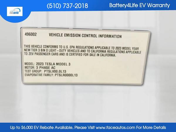 $2,000 instant rebate for qualifying Santa Clara County Residents (SVCE) and San Mateo County Residents (PCE) and Contra Costa, Marin County, Napa County, Solano County Residents (MCE), (not all customers qualify). For San Jose Residents (SJCE), please review the Full Program Guidelines and List of qualifying EVs to verify if you qualify.Additional PG&E $4,000 rebate for income qualified buyers (not all customers qualify), Driving Clean Assistance Program (DCAP) participating Dealership.Safety Done, AS LOW as $299 to drive off! Up to 72 months, 8.99% APR on approved credit!$18.30 for every $1000 borrowed, Available for Prime Credit Buyers, Not available for Uber/ Lyft DriverExtended Warranty available up to 60 mo/100,000 mi., Powertrain Plus, starting as low as $1999. Please click here for more info?? Se Habla Español, Teresa (510) 319-0751??No Licencia?, Matrícula Consular?, ITIN?, Bancarrota?, Reposiciones?, Nuevo en el Trabajo?, 1er Comprador?, No Crédito? -Está Aprobado!We Speak: English, Spanish, & Chinese (Cantonese)????International Driver License?, Foreign License?, Matricula?, Foreign Passport? or CA ID? No problem, We can get you car insurancE???? Easy Financing @www.faceautos.com , First Time buyer, Student Income, ITIN Welcome, SSI , Self - Employed, Uber And Lyft , Matricula ID , 0 Credit Score , Bankruptcy OK, Rate As Low As 8.99% on approved credit!2023 Tesla Model 3, 5YJ3E1EA2PF496002, 98,279, Standard Sedan 4D, AC Electric Motor, Single-Speed Fixed Gear, RWD, 4, , Sedan, Electric, , Blue, Black, , , , 8407 Central Ave Ste 2038, Newark, CA 94560, (510) 737-2018All advertised prices exclude government fees and taxes, any finance charges, any dealer document preparation charge, and any emission testing charge. While we try to make sure that all prices posted here are accurate at all times, we cannot be responsible for typographical and other errors that may appear on the site. We make every effort to provide you the most accurate, up-to-the-minute information; however, it is your responsibility to verify with the Dealer that all details listed are accurate. The dealership is not responsible for typographical, pricing, product information, advertising or shippingBuy used EV in Bay Area