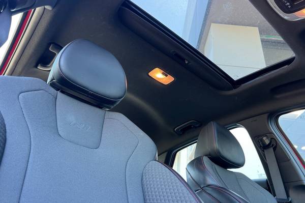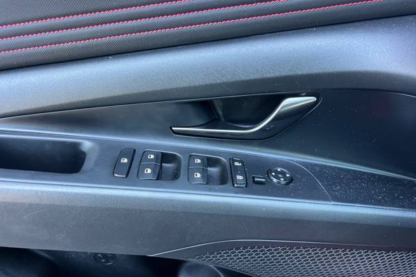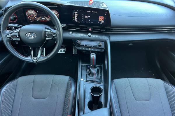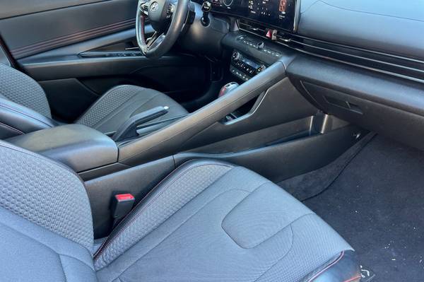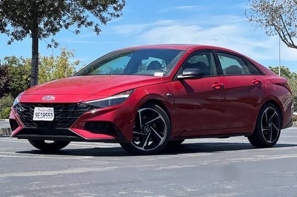 Backup Camera, Bluetooth, Alloy Wheels, Audio Package, Climate Package, Comfort Package, Heat Package, Light Package, NON SMOKER, Power Mirror Package, Power Package, Security Package, Sound Package, Elantra N Line, 4D Sedan, I4, 7-Speed Dual Clutch DCT, FWD, Scarlet Red Pearl, Black w/Cloth Seat Trim, 4-Wheel Disc Brakes, 6 Speakers, ABS brakes, Air Conditioning, Alloy wheels, AM/FM radio: SiriusXM, Apple CarPlay & Android Auto, Auto High-beam Headlights, Automatic temperature control, Brake assist, Bumpers: body-color, Cargo Net, Carpeted Floor Mats, Combination Cloth & Leather Seating Surfaces, Delay-off headlights, Driver door bin, Driver vanity mirror, Dual front impact airbags, Dual front side impact airbags, Electronic Stability Control, Emergency communication system: Blue Link Connected Car Service (3-year complimentary subscription), Exterior Parking Camera Rear, First Aid Kit, Four wheel independent suspension, Front anti-roll bar, Front Bucket Seats, Front Center Armrest, Front dual zone A/C, Front reading lights, Fully automatic headlights, Heated door mirrors, Heated front seats, Heated Front Sport Bucket Seats, Illuminated entry, Leather Shift Knob, Leather steering wheel, Low tire pressure warning, Navigation System, Occupant sensing airbag, Option Group 01, Outside temperature display, Overhead airbag, Overhead console, Panic alarm, Passenger door bin, Passenger vanity mirror, Power door mirrors, Power driver seat, Power moonroof, Power steering, Power windows, Radio: AM/FM/HD/SiriusXM Display Audio, Rear anti-roll bar, Rear Bumper Applique, Rear seat center armrest, Rear window defroster, Remote keyless entry, Security system, Speed control, Speed-sensing steering, Split folding rear seat, Spoiler, Sport steering wheel, Steering wheel mounted audio controls, Tachometer, Telescoping steering wheel, Tilt steering wheel, Traction control, Trip computer, Variably intermittent wipers. Scarlet Red Pearl 2023 Hyundai Elantra N Line FWD 7-Speed Dual Clutch DCT I4